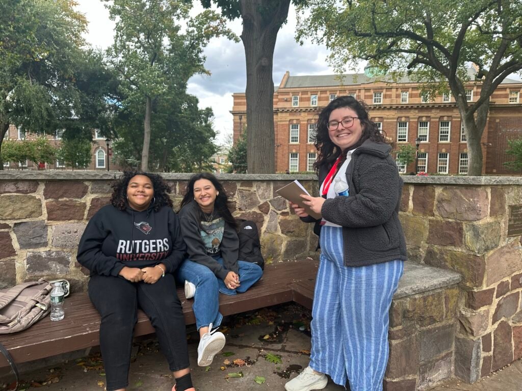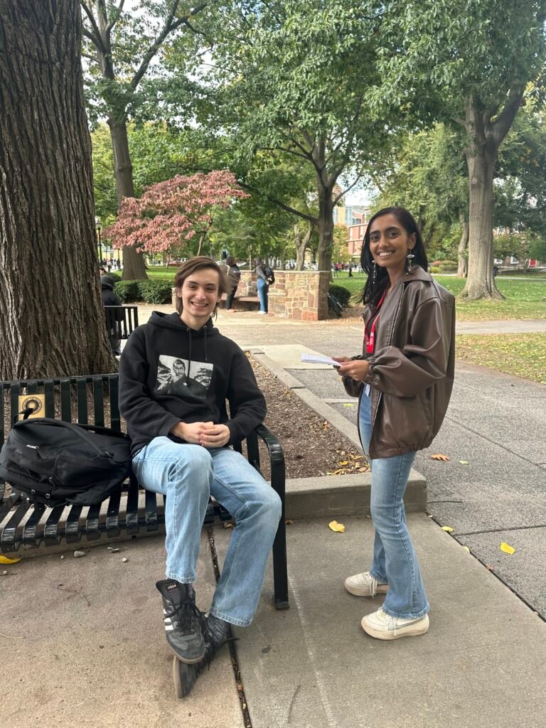 A member of Group Six interview a Rutgers student on campus