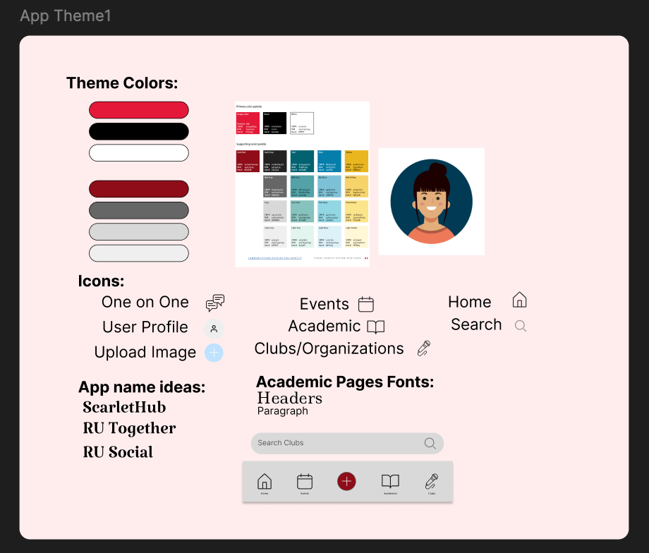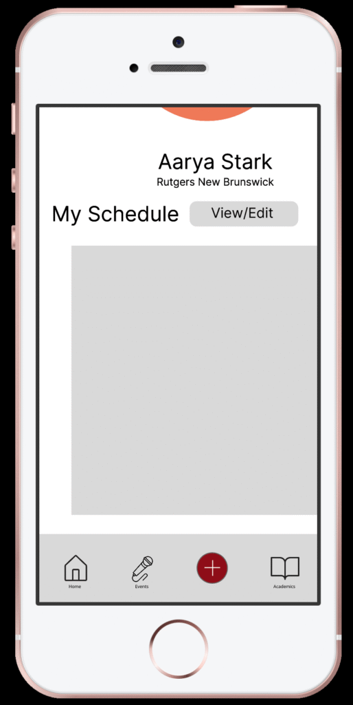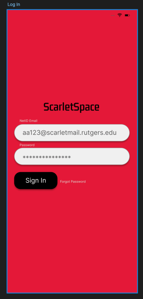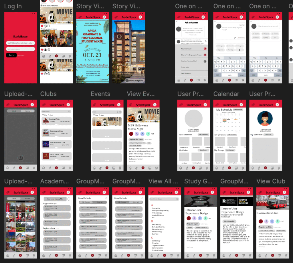 Keeping in mind user insights and design requirements, Group Six proceeded to embark on their prototyping journey. In order to make our design come to life, we used Figma to create a series of high fidelity wireframes to embody the digital product we named ScarletSpace, aptly themed to match Rutgers’ official school colors, scarlet red and black. As an official Rutgers affiliate app, students would be assigned a unique profile and log in information linked to their student email and Net ID password.